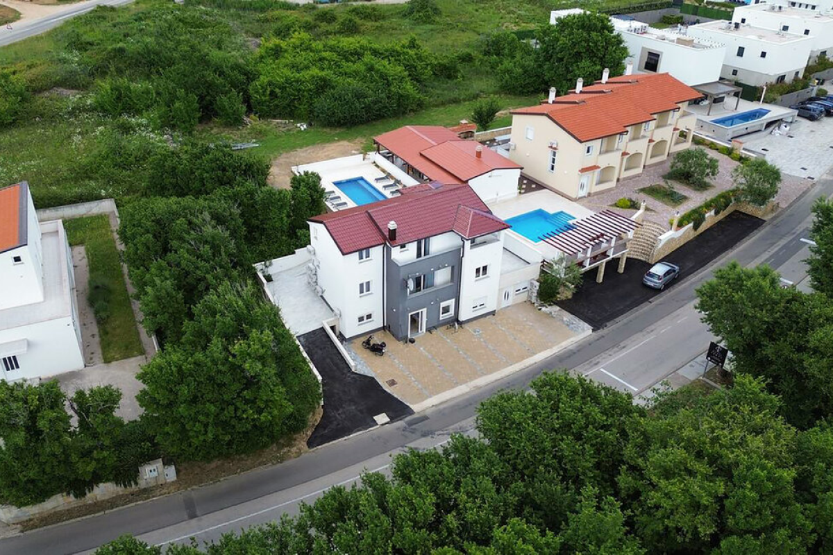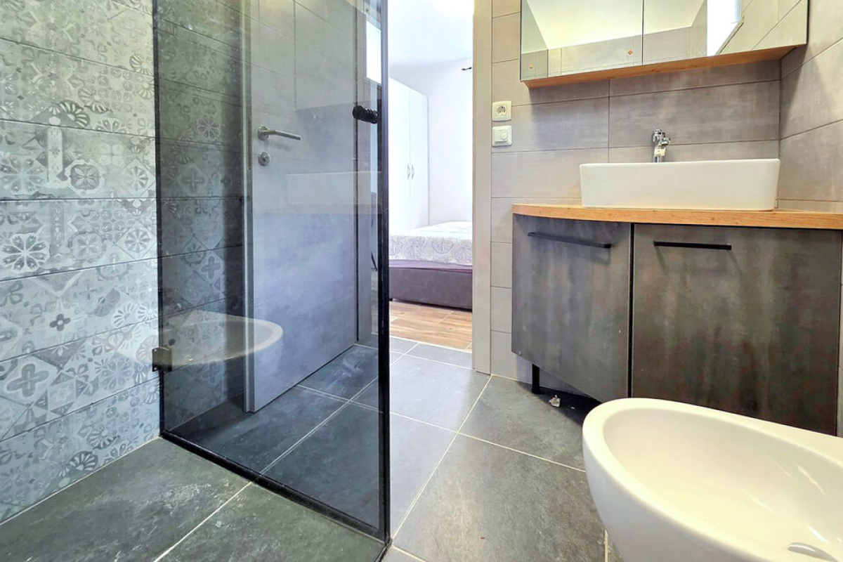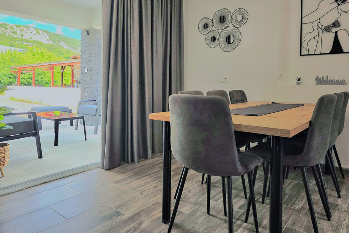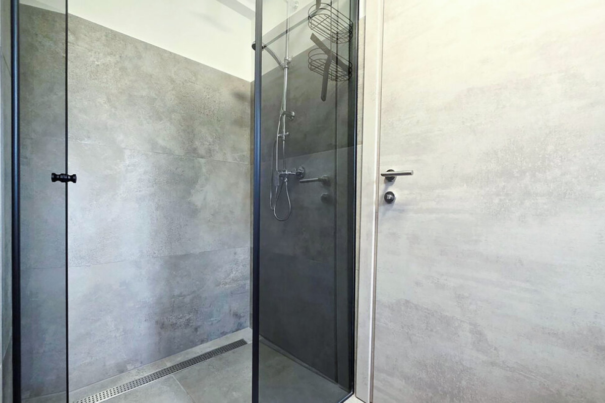 1st floor: On the first floor of the villa there is one bedroom, a richly equipped kitchen with the most modern appliances and a living room with a dining room, a spacious terrace with an outdoor dining area and a swimming pool with deckchairs and a sunbed.