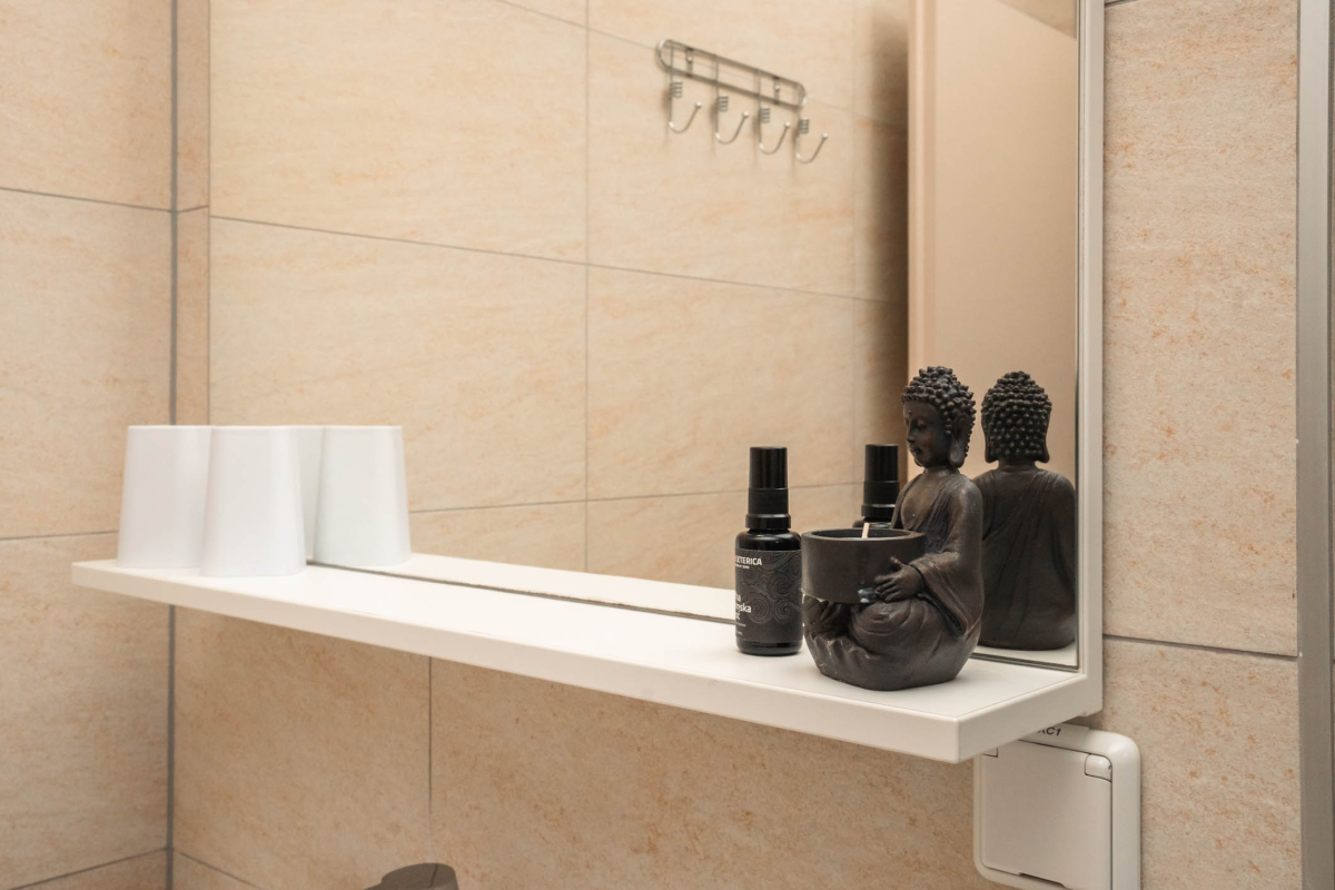 Bathroom: shower, hairdryer, toilet, 2x free toiletries and toilet paper