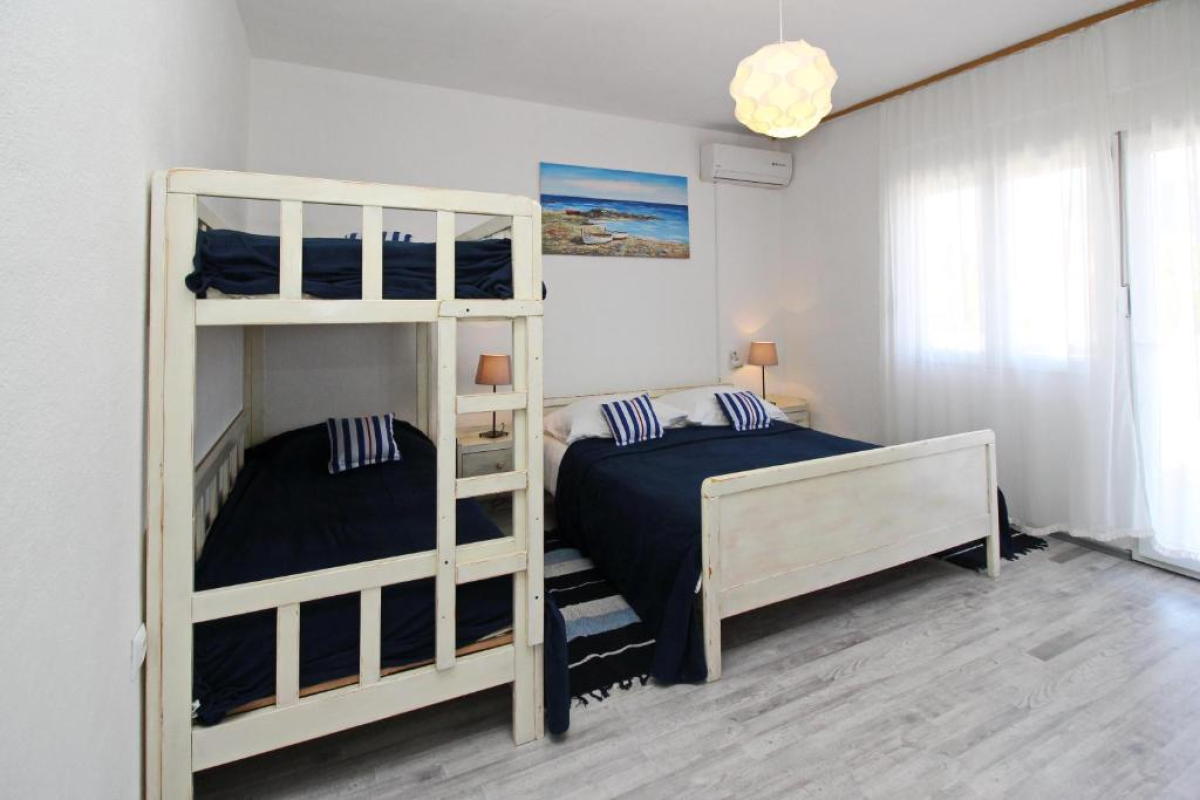 Beautiful newly furnished apartment only 250 meters from the sea. The apartment is located on the first floor and consists of two double bedrooms, one double bedroom has a bunk bed, kitchen with dining room and living room with sofa, bathroom, air conditioning and WI-Fi. The apartment has a large and spacious balcony with garden furniture and deck chairs. The maximum number of guests that can stay in this apartment is 6 people.