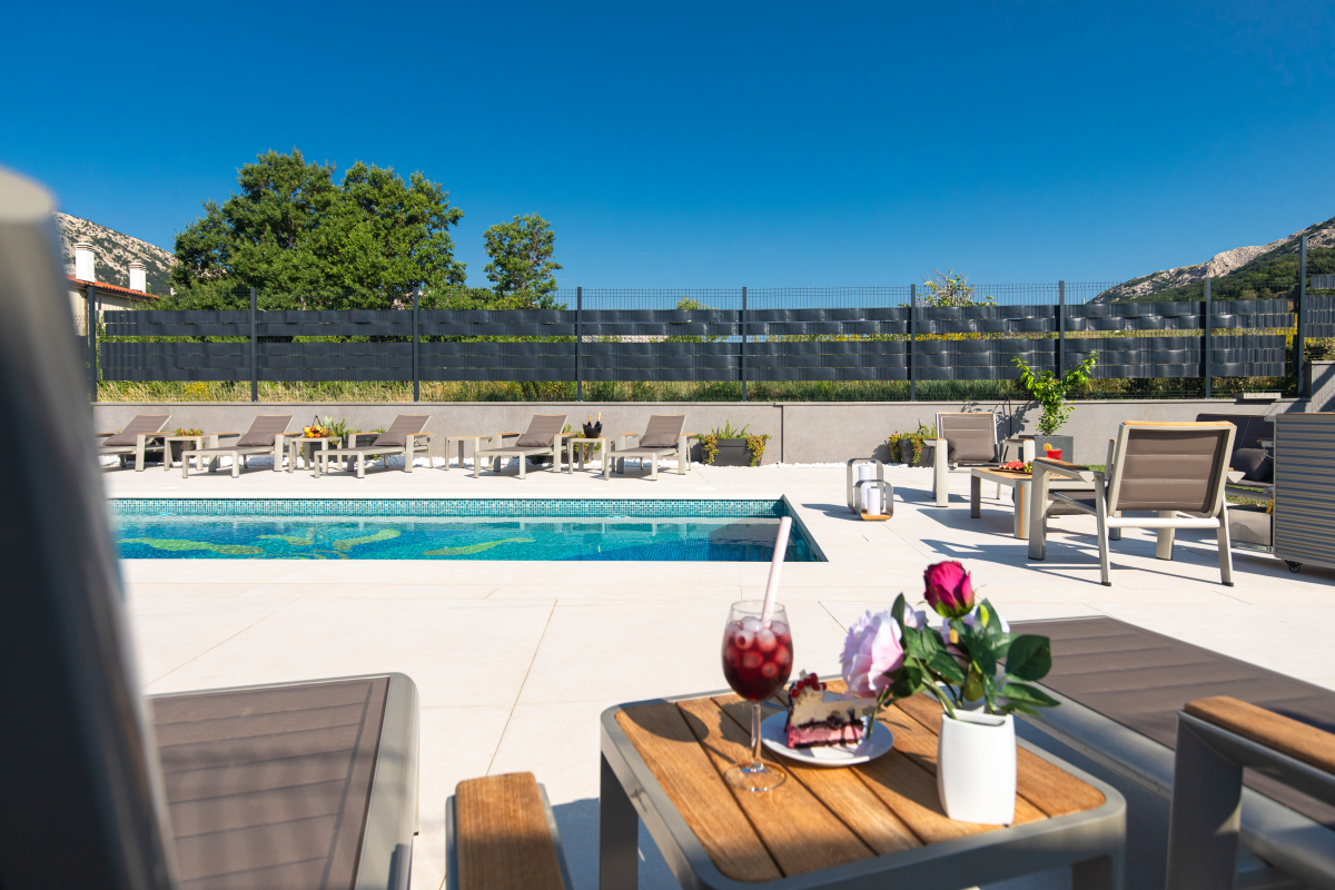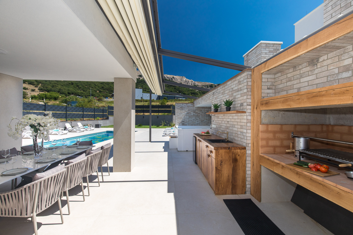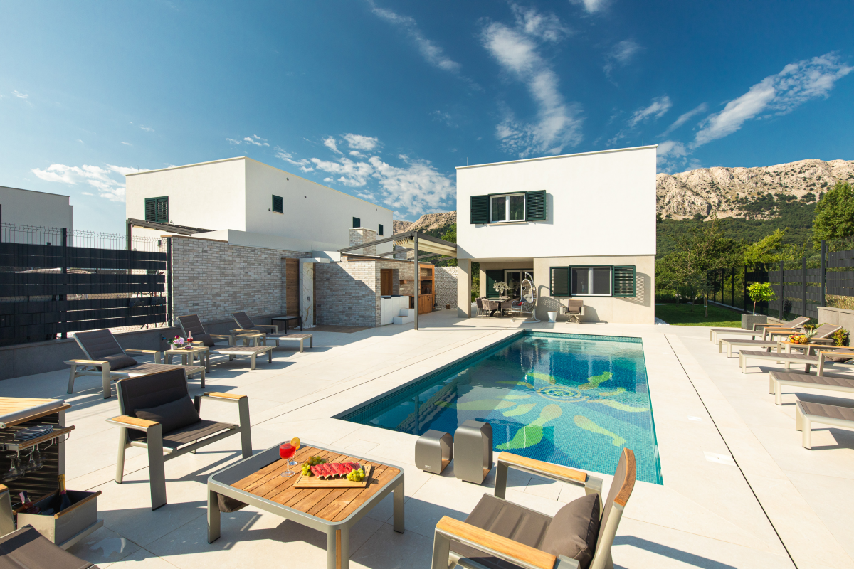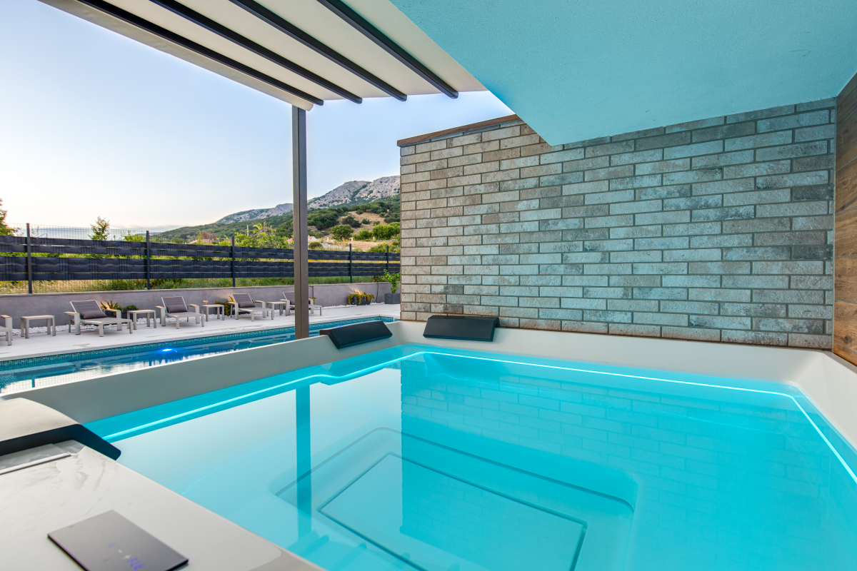 Luxury Villa Aurora is located in Baska on the island of Krk, only 850 m from the sea and the beach. The house of 147 m2 can accommodate up to 10 people. There are 4 bedrooms, 4 bathrooms, as well as a living room with a dining area and a kitchen. Each room has its own bathroom with shower. Ground floor: The ground floor of the villa has a living room and dining room with kitchen, as well as a bedroom with a bathroom. From the living room there is access to a beautiful terrace. 1st floor: On the first floor of the villa there are three more bedrooms with attached bathrooms. Outdoor: The outdoor area offers guests a barbecue, a covered seating area, a garden and a pool with sun loungers. Furthermore, the whirlpool completes the villa’s offering. The house is equipped with oven, dishwasher, washing machine, air conditioning, satellite TV and WiFi internet. It also includes a Playstation 4, karaoke, games for children as well as video surveillance for the parking lot. You can park your car directly in front of the house.