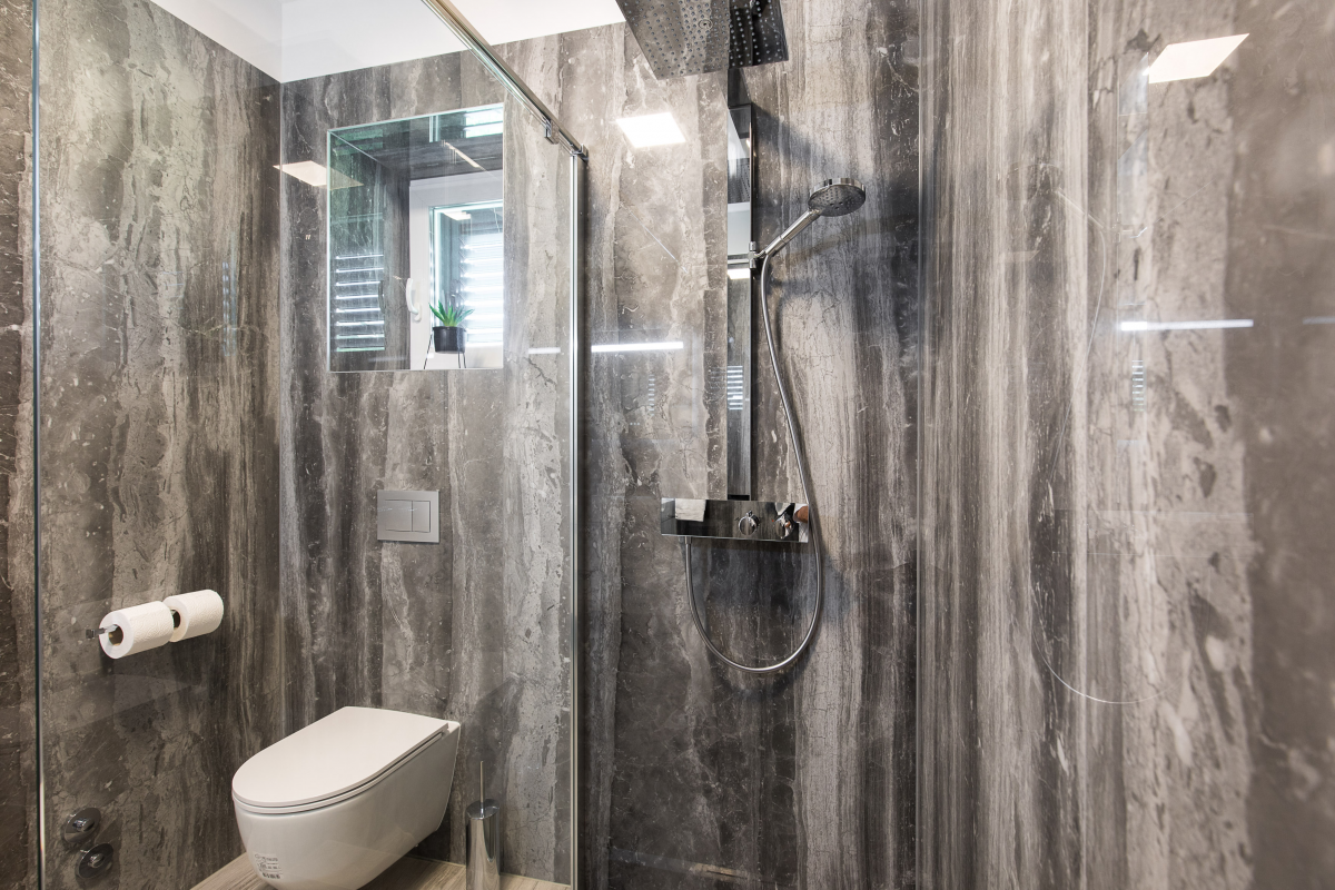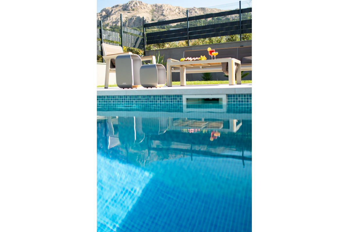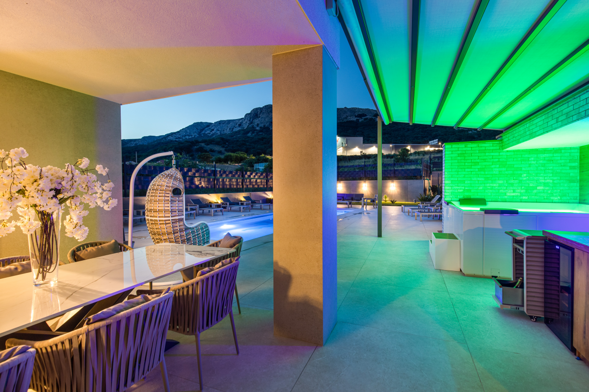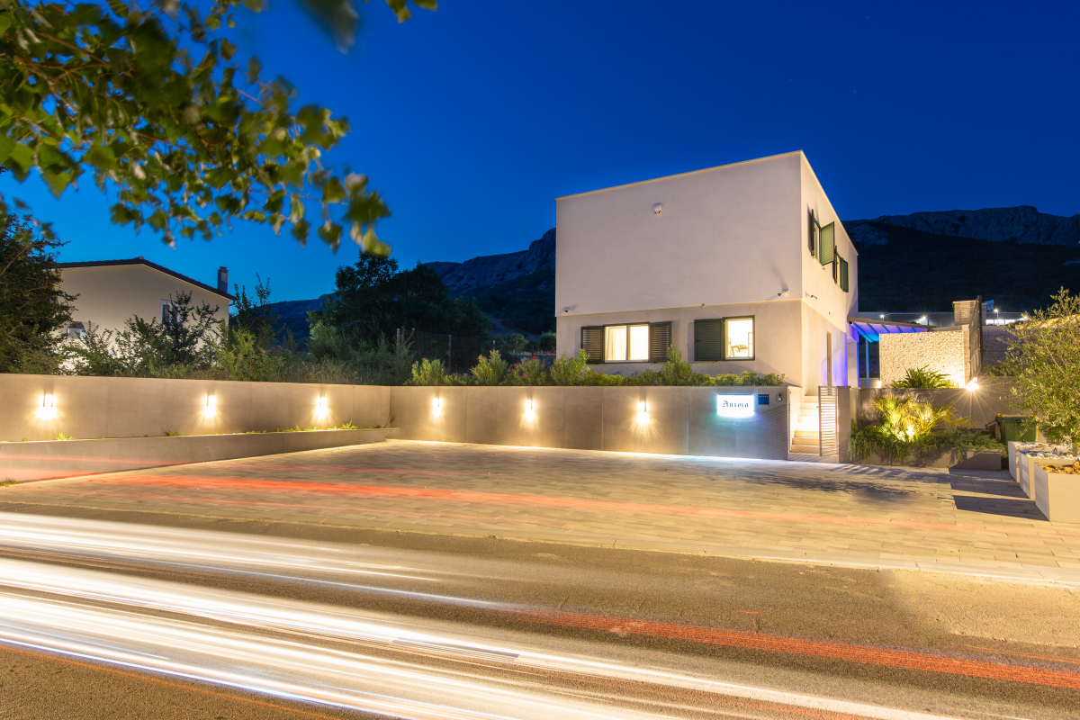 Luxury Villa Aurora is located in Baska on the island of Krk, only 850 m from the sea and the beach. The house of 147 m2 can accommodate up to 10 people. There are 4 bedrooms, 4 bathrooms, as well as a living room with a dining area and a kitchen. Each room has its own bathroom with shower. Ground floor: The ground floor of the villa has a living room and dining room with kitchen, as well as a bedroom with a bathroom. From the living room there is access to a beautiful terrace. 1st floor: On the first floor of the villa there are three more bedrooms with attached bathrooms. Outdoor: The outdoor area offers guests a barbecue, a covered seating area, a garden and a pool with sun loungers. Furthermore, the whirlpool completes the villa’s offering. The house is equipped with oven, dishwasher, washing machine, air conditioning, satellite TV and WiFi internet. It also includes a Playstation 4, karaoke, games for children as well as video surveillance for the parking lot. You can park your car directly in front of the house.