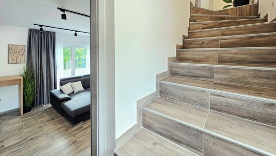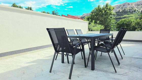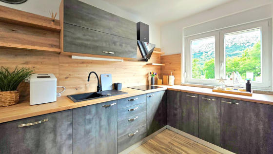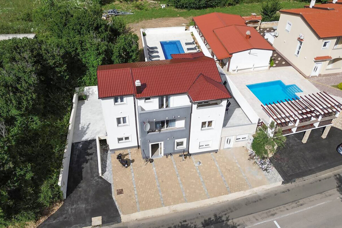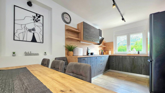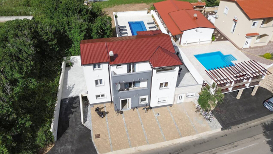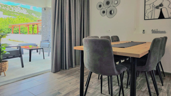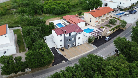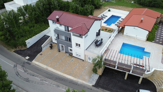1. Stock: Im ersten Stock der Villa befinden sich ein Schlafzimmer, eine großzügig ausgestattete Küche mit modernsten Geräten, ein Wohnzimmer mit Esszimmer, eine großzügige Terrasse mit Essbereich im Freien sowie ein Swimmingpool mit Sonnenliegen und Liegewiese.