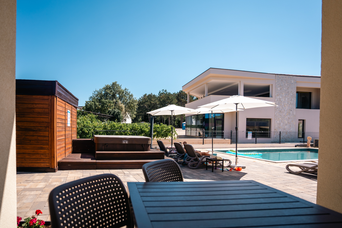 Das Resort besteht aus 12 komfortablen Apartments mit Fußbodenheizung, einer Außensauna, einem Whirlpool, einem beheizten Pool, einem Grillplatz und einem Ruhebereich.
