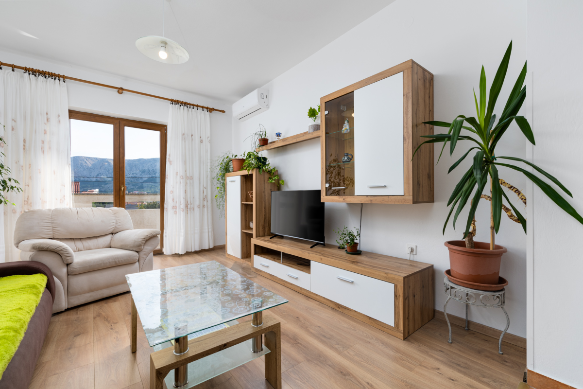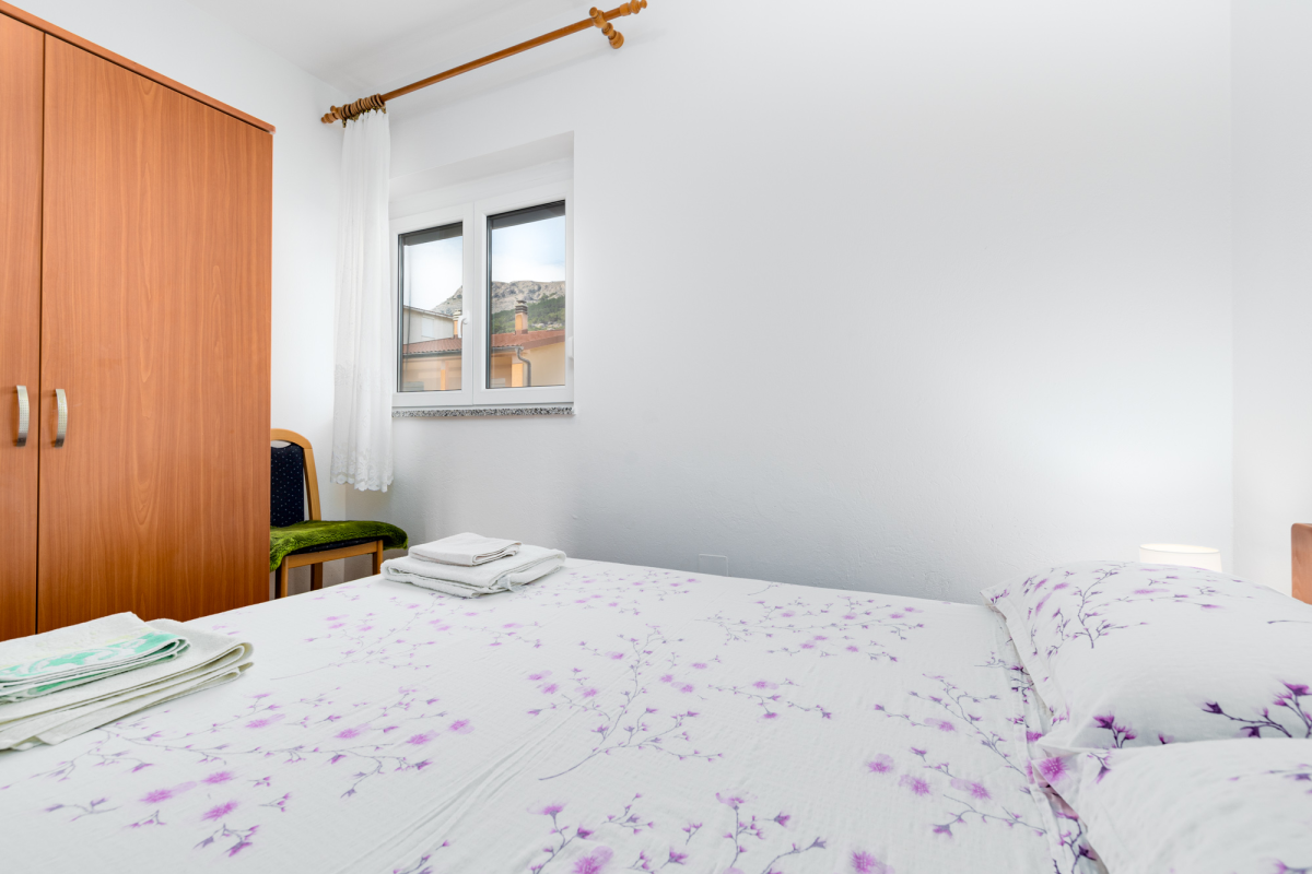 Eine geräumige und schön eingerichtete Wohnung. Die Wohnung befindet sich im ersten Stock und besteht aus einer großen Terrasse, drei Schlafzimmern, einer Küche ausgestattet mit einem Kühlschrank mit Gefrierfach, einem Mikrowellenkessel, einer Kaffeemaschine, einem Herd und Geschirr, einem Esszimmer, einem Wohnzimmer und ein Badezimmer. Die Wohnung verfügt außerdem über eine Klimaanlage, Sat-TV und WLAN. Der Parkplatz befindet sich vor dem Haus.