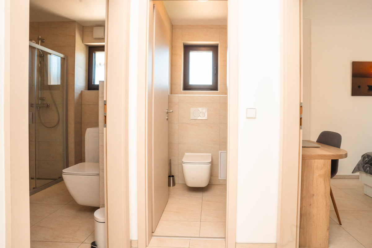 Badezimmer: Dusche, Haartrockner, Toilette, 2x kostenlose Toilettenartikel und Toilettenpapier