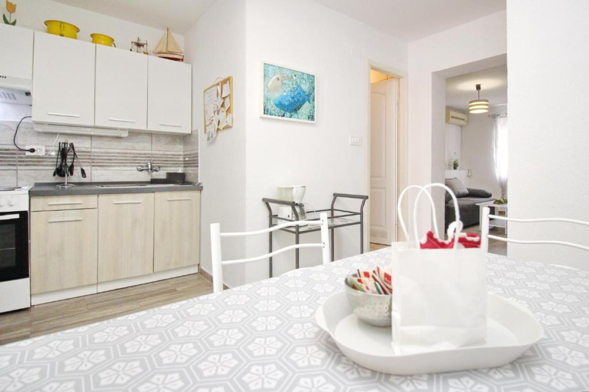 Schöne neu eingerichtete Wohnung nur 250 Meter vom Meer entfernt. Die Wohnung befindet sich im Erdgeschoss und besteht aus einem Schlafzimmer mit Doppelbett, einem weiteren Einzelbett im Zimmer, einer Küche mit Esszimmer, einem Wohnzimmer mit Schlafsofa, einem Badezimmer, einer Klimaanlage und WLAN. Vor der Wohnung befindet sich eine große Terrasse mit Gartenmöbeln und Grill. Die maximale Anzahl von Gästen, die in diesem Apartment übernachten können, beträgt 4 Personen.