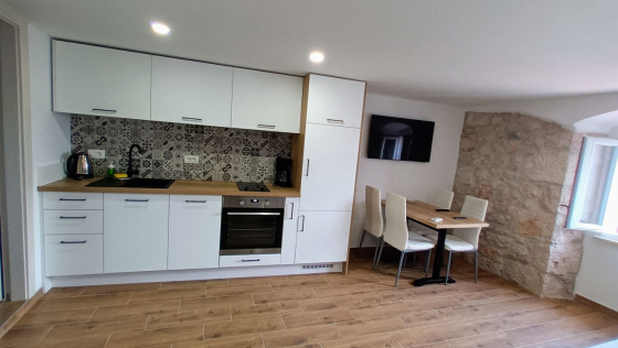 kuhinje, kupaonice i dnevnog boravka u kojem se nalazi kauč na razvlačenje. Također raspolaže mašinom za suđe, kuhalom za vodu, pećnicom, frižiderom,