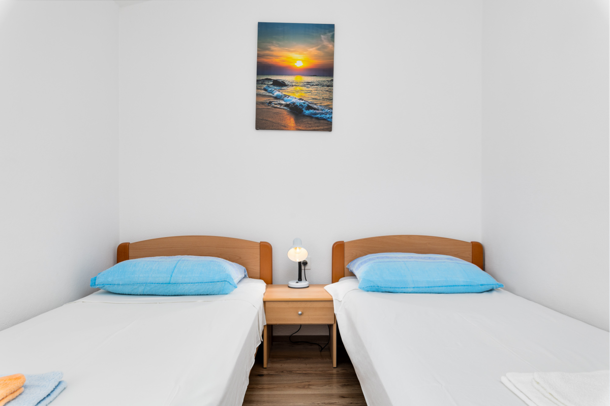 Prostran i vrlo ukusno i udobno uređen stan. Apartman se nalazi na drugom katu i sastoji se od velike terase, tri spavaće sobe, kuhinje opremljene hladnjakom sa zamrzivačem, tosterom mikrovalnom kuhalom za vodu, aparatom za kavu, štednjakom i posuđem, blagovaonicom, dnevnim boravkom i kupaonicom. Apartman također ima klimu, SAT TV i Wi-Fi. Parkirno mjesto se nalazi ispred kuće.