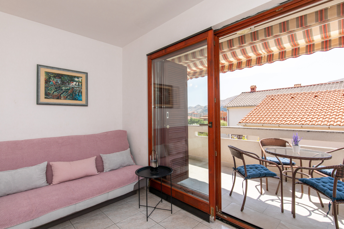 Lijep apartman na prvom katu sa natkrivenim balkonom.Apartman ima dvije dvokrevetnu spavaće sobe sa odvojenim krevetima, kuhinju sa dnevnim boravkom / blagovaonicom, pećnicom, mikrovalnom i kupaonicom. Apartman raspolaže sa klima uređajem, SAT TV-om, WiFi te jednim parkirnim mjestom ispred apartmana.Maximalan broj gostiju u ovom apartmanu iznosi 5 osoba.