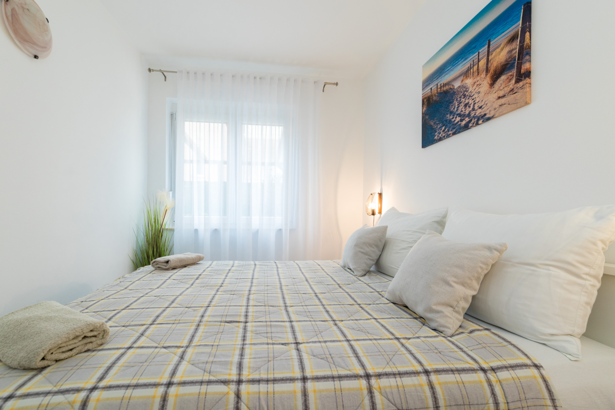 Hübsches Apartment im Erdgeschoss mit große überdachte Terrasse. Apartment verfügt über ein Schlafzimmer mit Doppelbett eine Küche mit Wohn/Essraum und ein Bad.Klimaanlage, Sat-Fernseher, WIFI und Parkplatz vor dem Apartment stehen Gästen zur Verfügung.