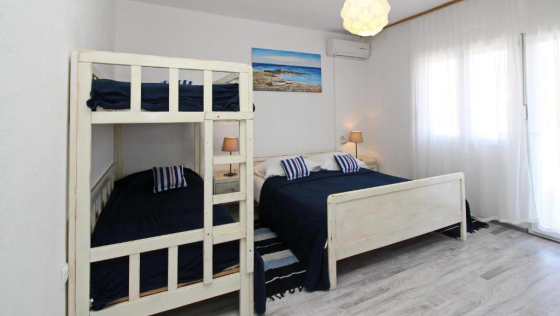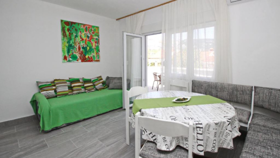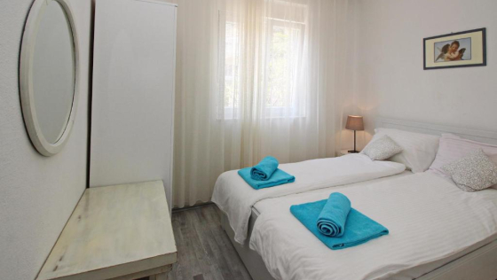 Prekrasan novoopremljen apartman udaljen samo 250 metara od mora.Apartman se nalazi na prvom katu i sastoji se od dvije dvokrevetne spavaće sobe, u jednoj dvokrevetnoj sobi nalazi se krevet na kat, kuhinje sa blagavaonicom i dnevnim boravkom sa kaučem, kupaonicom, klima uređajem i WI-Fi. Apartman raspolaže velikim i prostranim balkonom sa vrtnom garniturom i ležaljkama.Maximalan broj gostiju koji mogu boraviti u ovom apartmanu je 6 osoba.