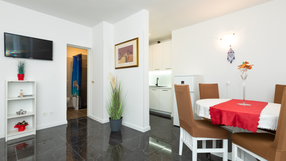 Simpatičan apartman u prizemlju sa velikom terasom.Apartman raspolaže sa jednom spavaćom sobom, kuhinjom,dnevnim boravkom /blagovaonica i kupaonicom s tušem.Ovaj je apartman klimatiziran, ima satelitsku TV i bežični pristup internetu.Parking se nalazi ispred apartmana.Maximalan broj gostiju u ovom apartmanu iznosi 2 osobe.