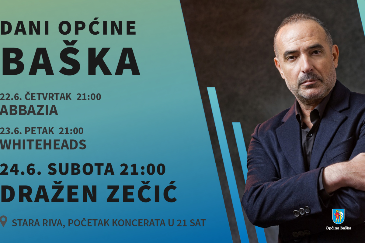 13:00 Formal session of the Municipal Council in the hotel "Corinthia" in Baška, with the performance of Klapa ZVONIMIR and children of the Regional Kindergarten Baška, and the folklore group of the Cultural Center GATALINKA Vinkovci.